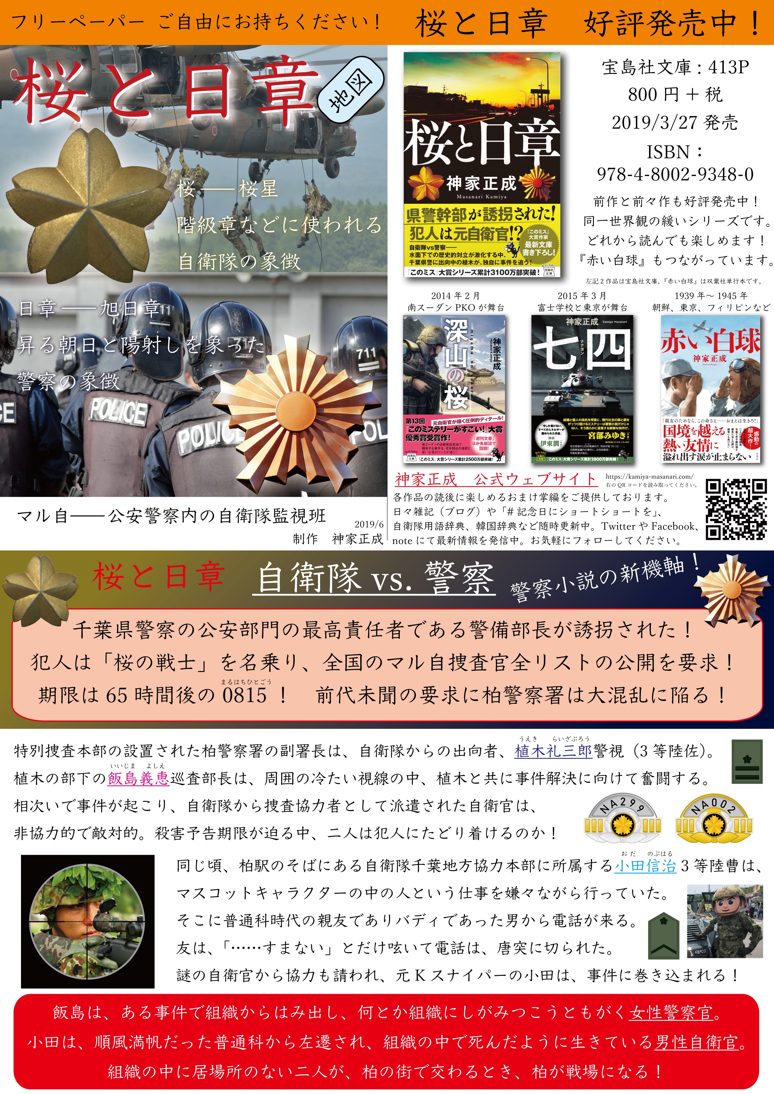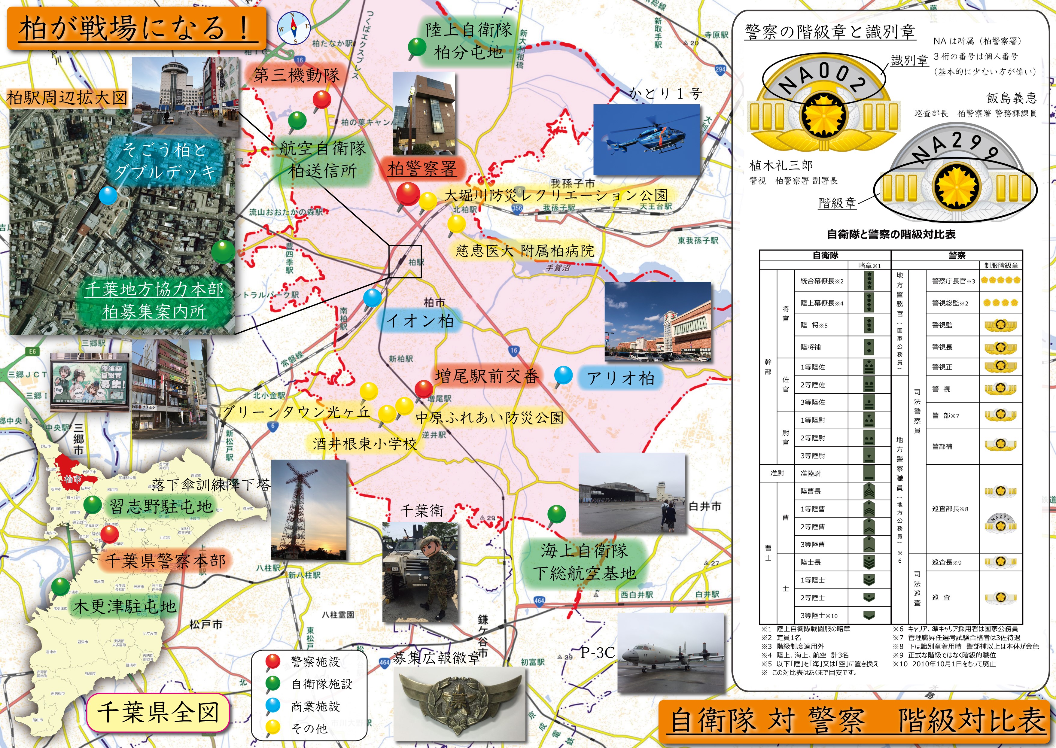 今回は私の地元、千葉県柏市が舞台です。柏の地図と自衛隊と警察の階級対比表を載せました。表側は半分に折るとPOPとしても使えるような構成にしております。